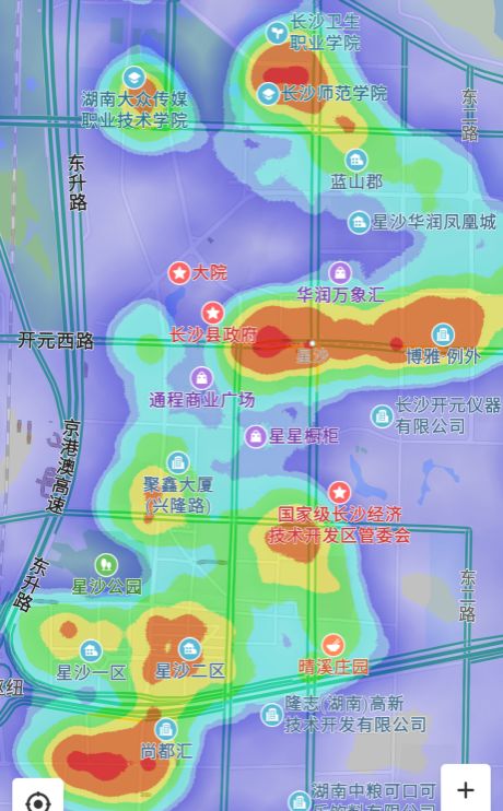 星沙白天热力图较亮,夜晚更亮,白天和晚上都是很热闹的地方。