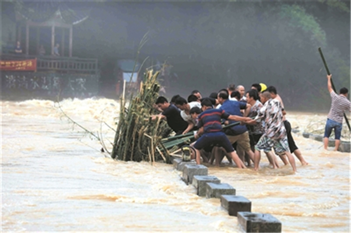 6月10日,融安县大将镇东潭村大潭屯,党员干部和村民清理阻拦在大桥上的竹子。本报通讯员 谭凯兴 摄