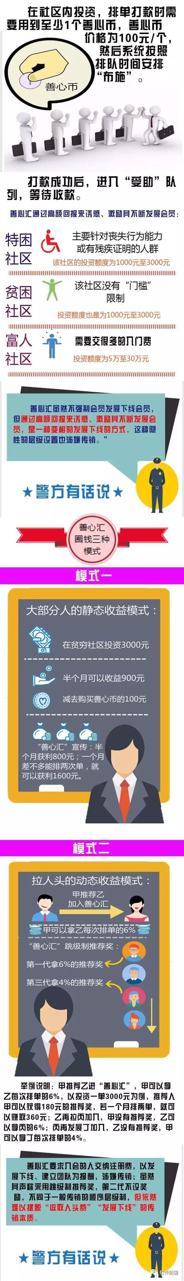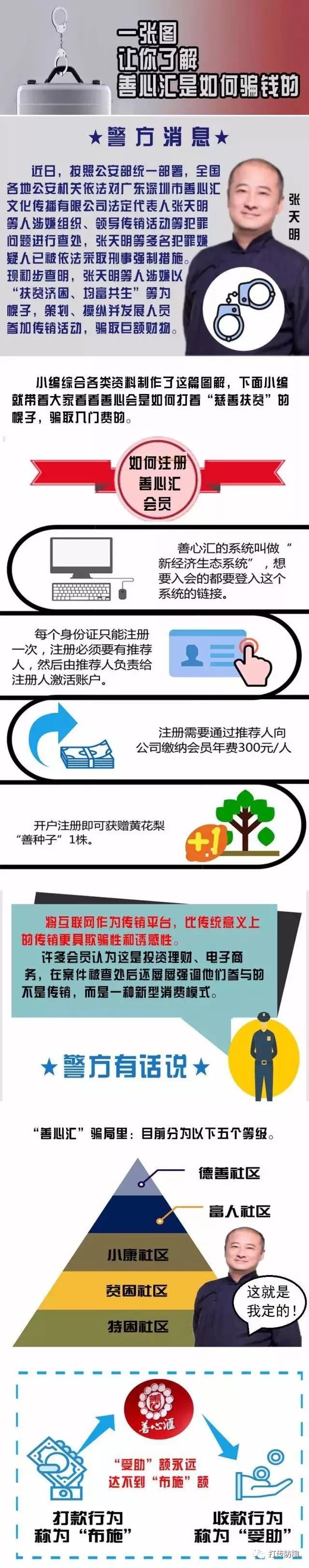 2013年5月,张天明注册成立深圳市善心汇文化传播有限公司(以下简称“善心汇”公司)。2016年3月起,张天明、燕吉利、查方胜、宋文军等人以“众扶互生系统”为依托,以“扶贫互助”为名,以高额回报为诱饵,采取培训、宣传等多种方式在全国各地发展会员,骗取财物,要求参加者以缴纳300元购买“善种子”的方式获得加入资格,并按照一定顺序组成层级,会员之间根据“善心汇”确定的收益规则进行资金往来,以发展下线的数量作为返利依据,会员的获利收益全部来源于后期会员投入的资金。