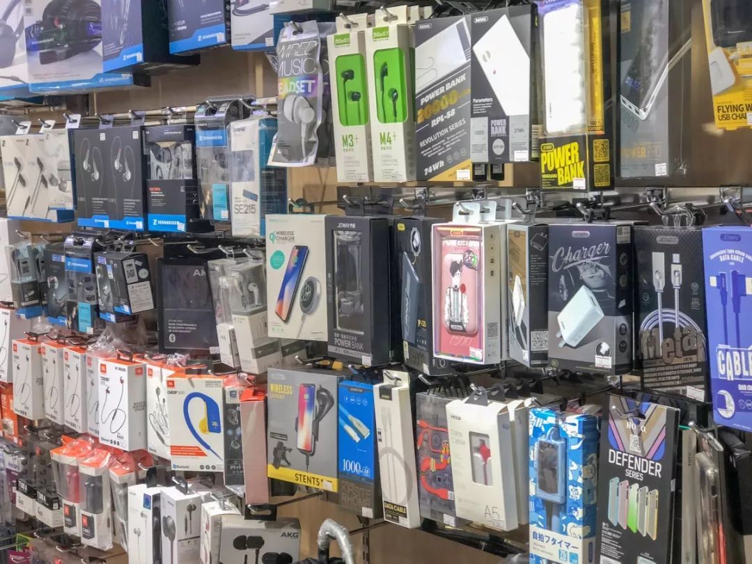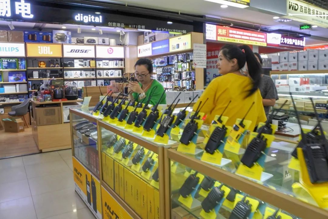 货架上堆着凌乱的电子小件,还有罕见的老式对讲机、步步高、廉价耳机...散客在狭窄的走道上穿梭,无数电子货品的陈列,俨然一股复古赛博朋克风。