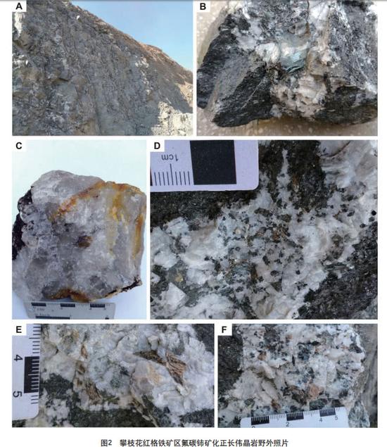 稀土矿化碱性杂岩主要由粗粒正长岩、正长伟晶岩(图2-B)和中—细粒角闪正长岩、霓辉正长岩等岩石类型组成,并伴随出现一些石英-萤石脉(图2-C)矿区内尤其以矿化粗粒正长岩-正长伟晶岩最为醒目、大量出现;主要呈脉状、网脉状或岩枝状侵位于钒钛磁铁矿体或矿化铁镁质岩体中,其宽度常从几厘米至几十厘米不等,宽者可达数米,密度大(图2-A),成群产出,脉体群延伸从数百米至数千米不等。矿化碱性杂岩的矿物成分较复杂,主要矿物有钾长石(正长石、微斜长石)、黑云母、角闪石、辉石(霓石、霓辉石),少量斜长石、石英、萤石、锆石、榍石等矿物。稀土矿物主要为氟碳(钙)铈矿,多呈稀疏浸染状或星点状,矿物新鲜面呈蜡黄色至淡红棕色,具有玻璃光泽到油脂光泽,结晶程度较好,主要呈片状、板状,局部可见自形晶的六方晶形(图2-D~F)。