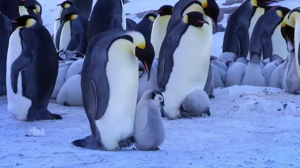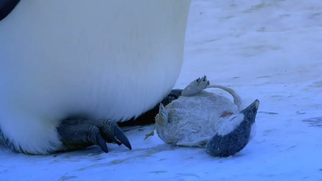 很令人心酸的画面就是当小企鹅好不容易出生,步履蹒跚的向这个世界问好,却因为长时间离开父母的育儿袋而冻僵死去,企鹅妈妈用嘴去触碰冻僵的孩子,企图将它塞回育儿袋,眼泪禁不住就跟着掉下来。