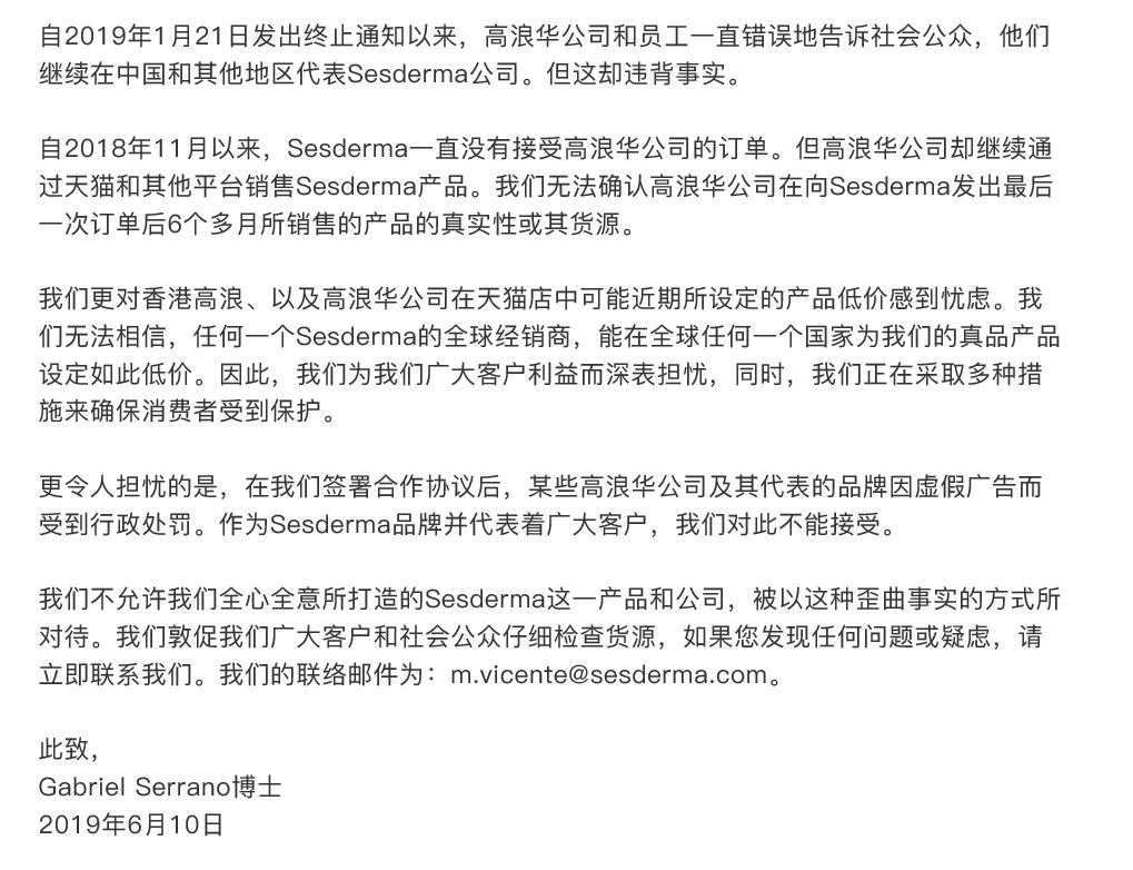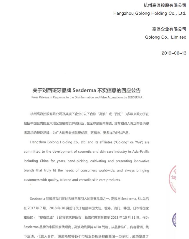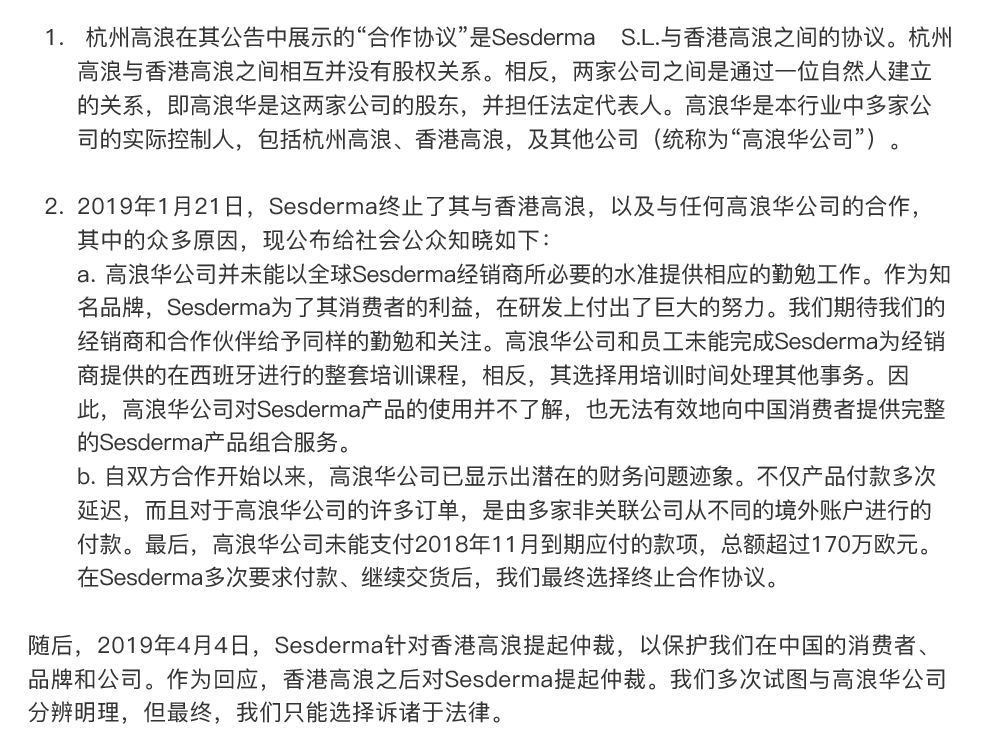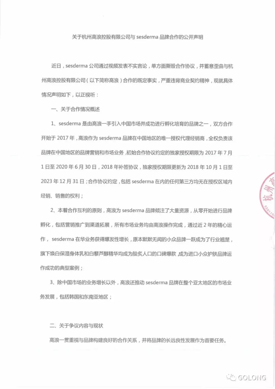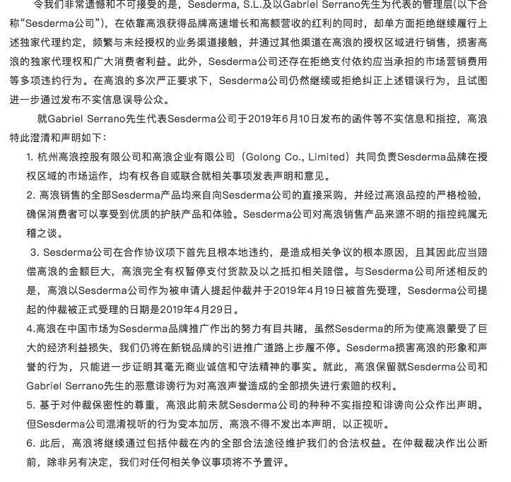 随后,高浪也发布了的一则公开申明回应道,“Sesderma和高浪双方合作开始于2017年,高浪作为sesderma品牌在中国地区的唯一授权代理经销商,全权负责该品牌在中国地区的品牌营销和市场业务,初始合作协议约定的独家授权期限为2017年7月1日至2020年6月30日,2018年补签协议,独家授权期限更新为2018年10月1日至2023年12月31日;合作协议约定,包括sesderma在内的任何第三方均无在授权区域内经销、销售的权利。”