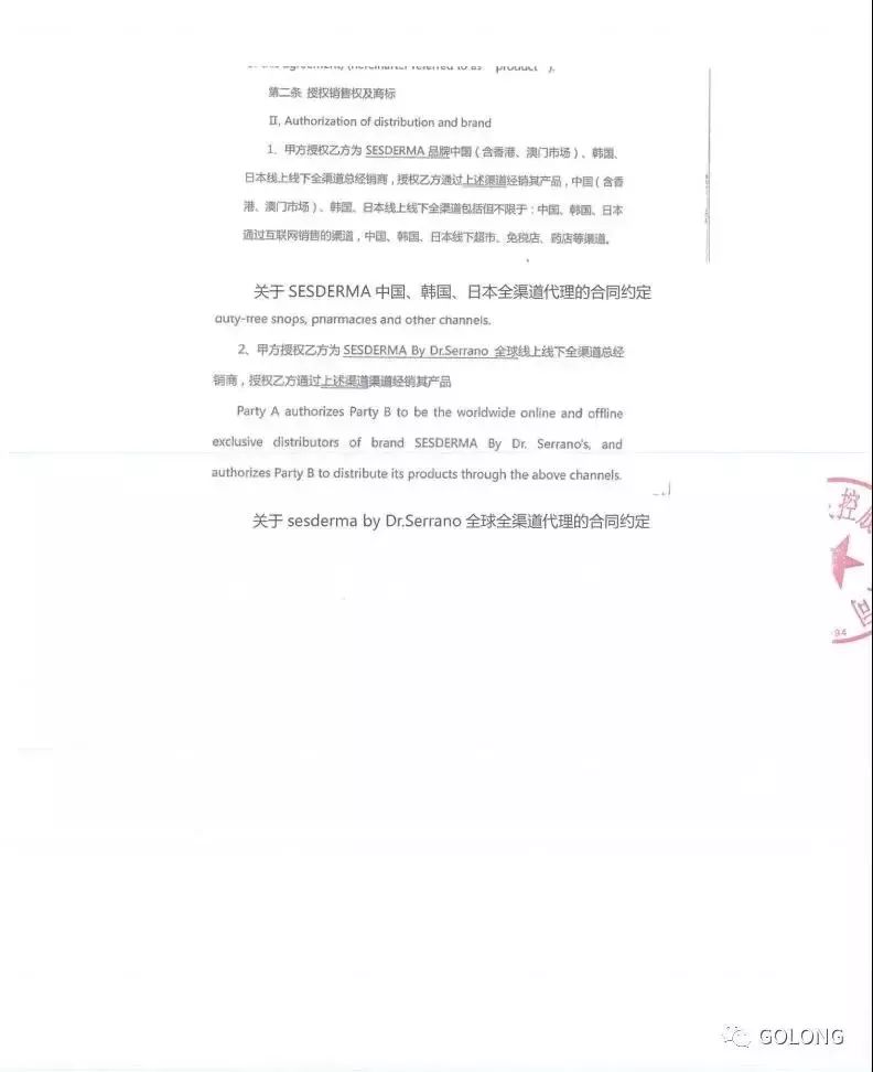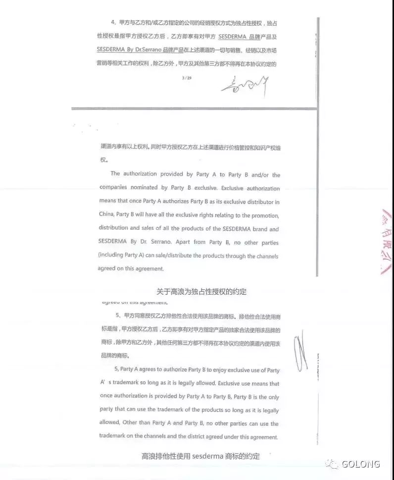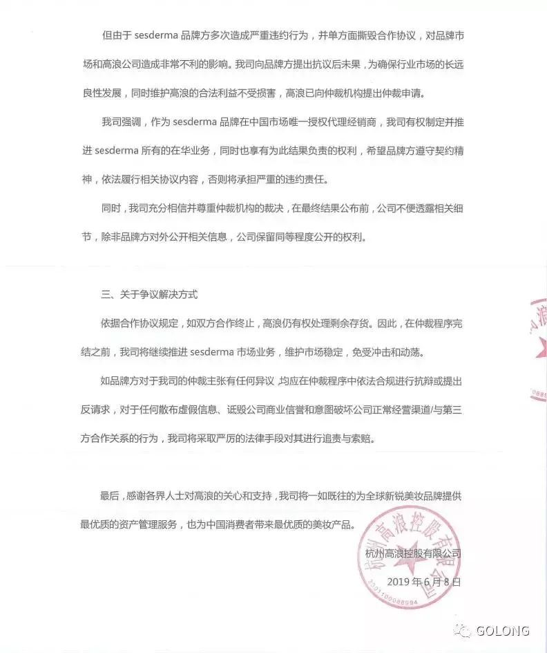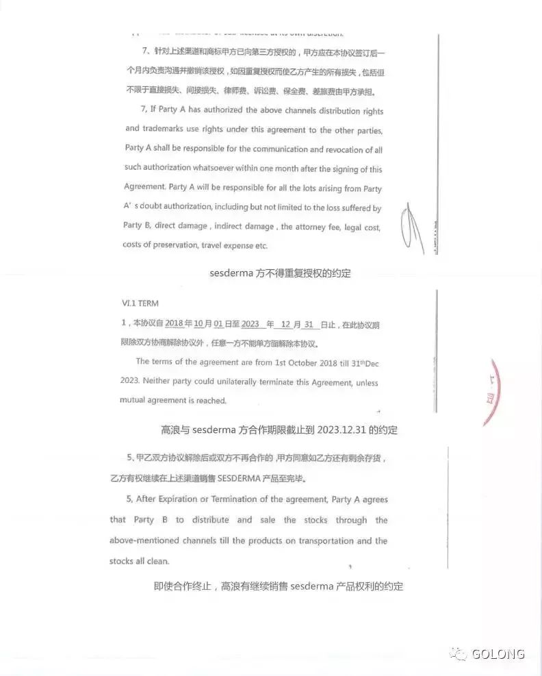 随后,高浪也发布了的一则公开申明回应道,“Sesderma和高浪双方合作开始于2017年,高浪作为sesderma品牌在中国地区的唯一授权代理经销商,全权负责该品牌在中国地区的品牌营销和市场业务,初始合作协议约定的独家授权期限为2017年7月1日至2020年6月30日,2018年补签协议,独家授权期限更新为2018年10月1日至2023年12月31日;合作协议约定,包括sesderma在内的任何第三方均无在授权区域内经销、销售的权利。”