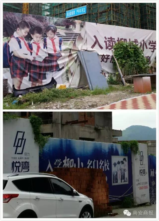 此前在建的龙润湾美(左图)和创力悦湾(右图)小区户外广告体现“入读XX学校”。