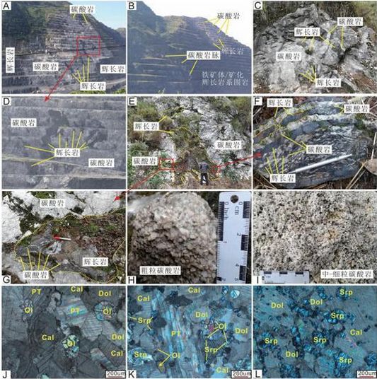 空间上,火成碳酸岩与钒钛磁铁矿体或矿化铁镁质岩体、正长岩体紧密共/伴生,总体呈近S—N向的带状分布,受控于区域构造明显。火成碳酸岩主要呈岩脉/墙、岩枝、大岩株状产出,侵入老地层或二叠纪钒钛磁铁矿体、矿化铁镁质岩体中,或是“顺层”侵入层状堆晶辉长岩中(图1-A~G),岩石可见粗粒、中粒及细粒结构(图1-H~I)。镜下薄片初步鉴定出主要矿物有方解石、白云石和橄榄石(图1-J~L),部分橄榄石已局部或完全蛇纹石化,副矿物可见自形晶斜锆石;依据碳酸盐矿物,可进一步细分为白云石碳酸岩、方解石碳酸岩及复合型碳酸岩。