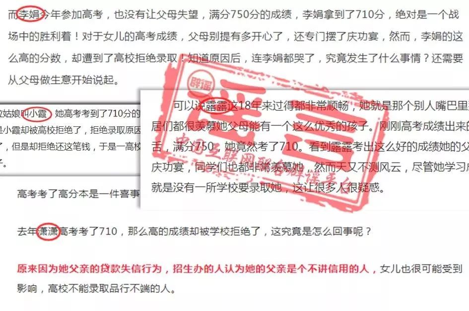 通过搜索发现,这个故事流传已久。各版本情节相同,都是因为父亲是“老赖”,女儿考了710分却未被录取,不同的只是考生名字不一样,今年你看到的是“潇潇”,明年可能变成“李娟”“小霞”“露露”。