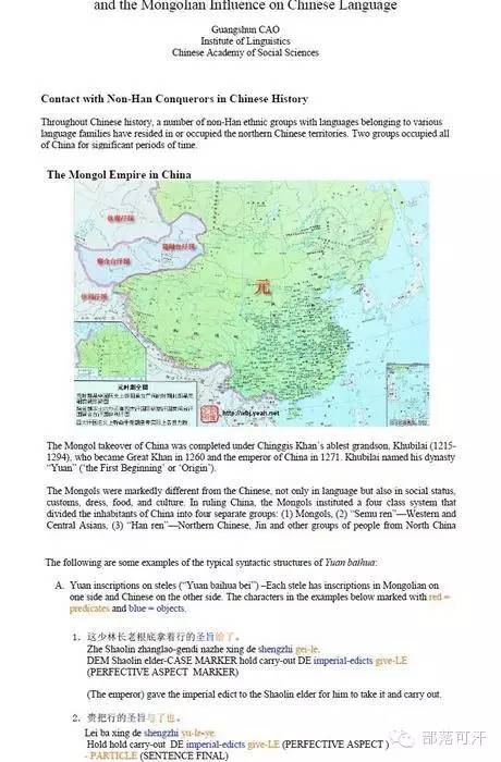 《蒙古帝国在中国统治以及蒙古语对中文的影响》的首页。此学术报告由中国社科院曹广顺用英文写成。