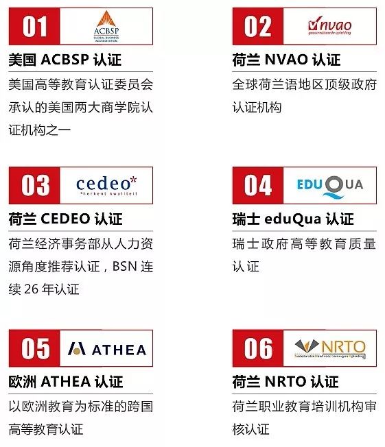 商学院认证是工商管理教育的试金石,是社会评价商学院的参照物,能从不同角度衡量教育成果,检验学位证书的含金量。迄今,BSN荷兰商学院已经成为全球为数不多的获得六项国际权威认证的欧洲一流商学院。