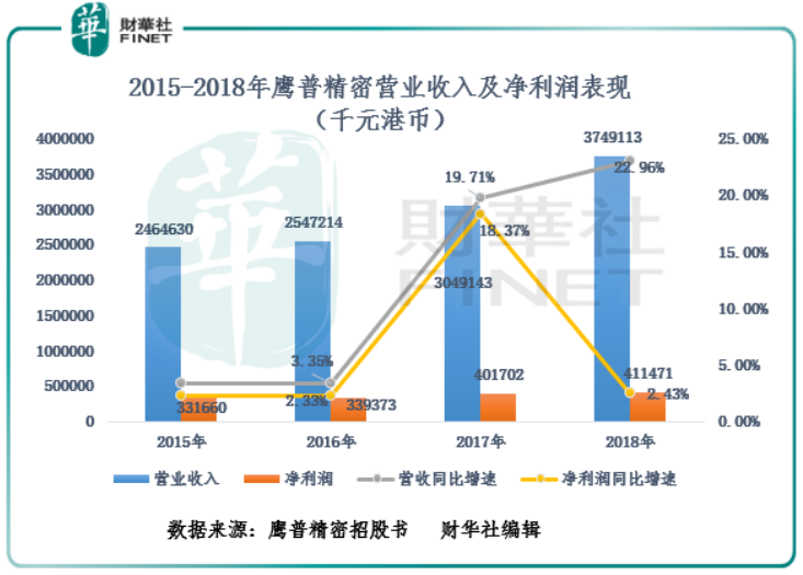 截至2018年底,鹰普精密的营业收入从2015年的24.65亿港元增至2018年的37.49亿港元,年复合增速为11.05%。净利润则从2015年的3.31亿港元增至2018年的4.11亿港元,年复合增速为5.56%。