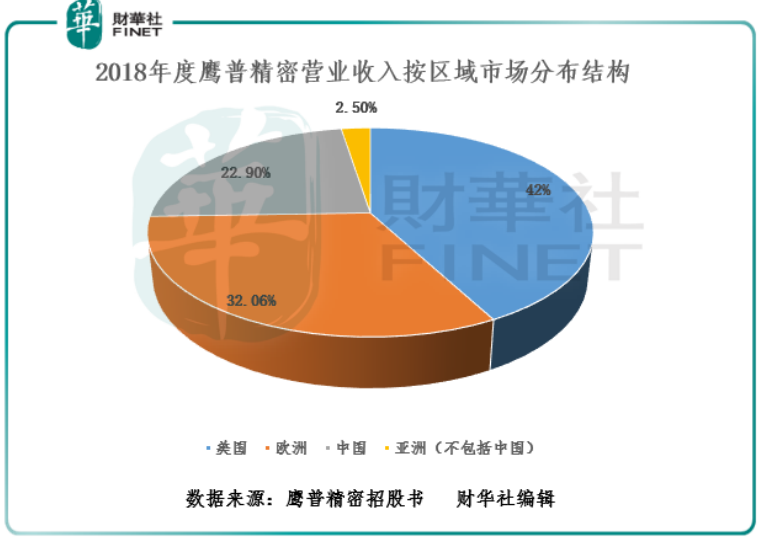 从营业收入按区域市场分布上看,公司77.1%的销售收入来源海外市场,其中美国是鹰普精密最主要的销售市场,也是最主要的收入来源,占比高达42%。
