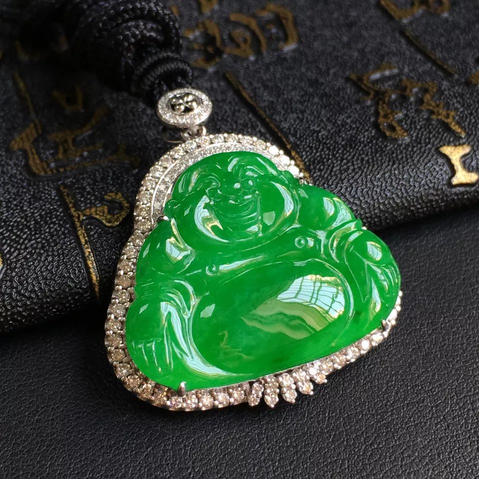 镶白18K金钻石糯冰种翠色玉佛胸坠