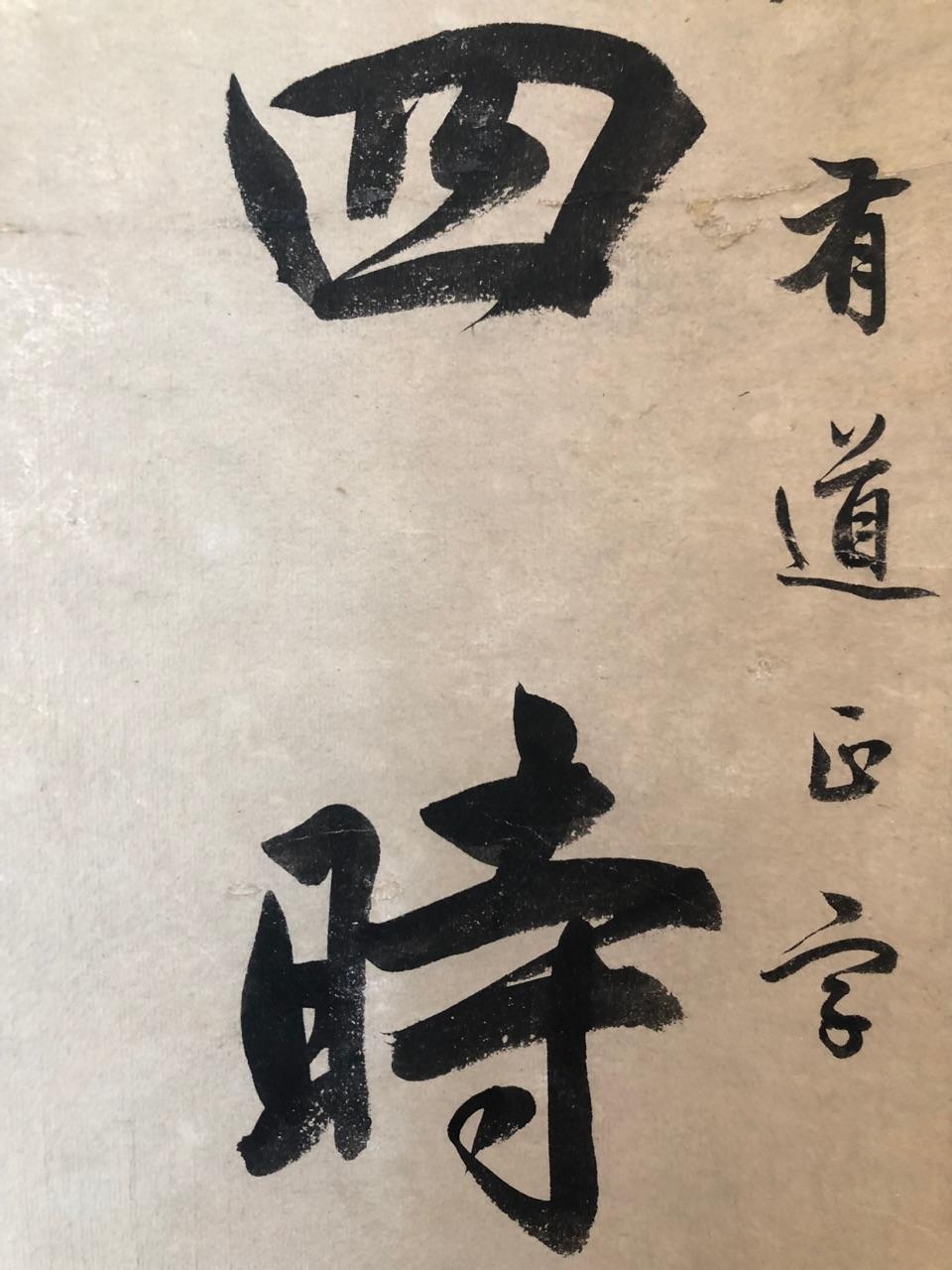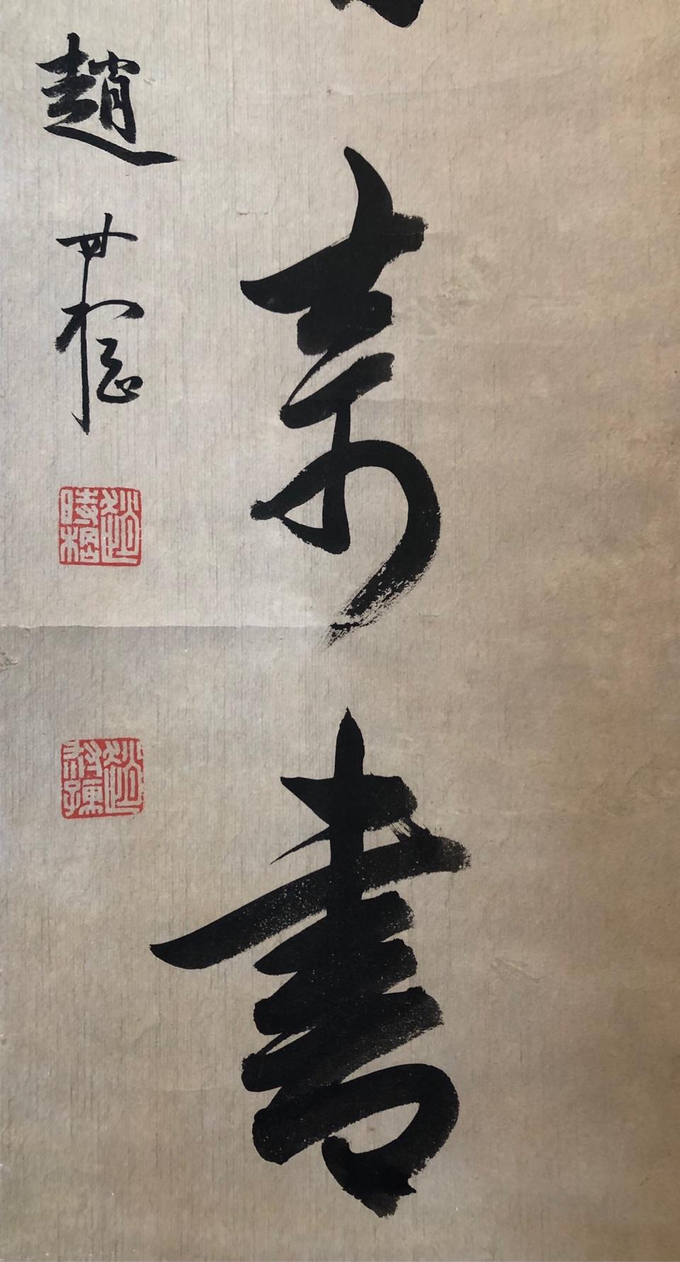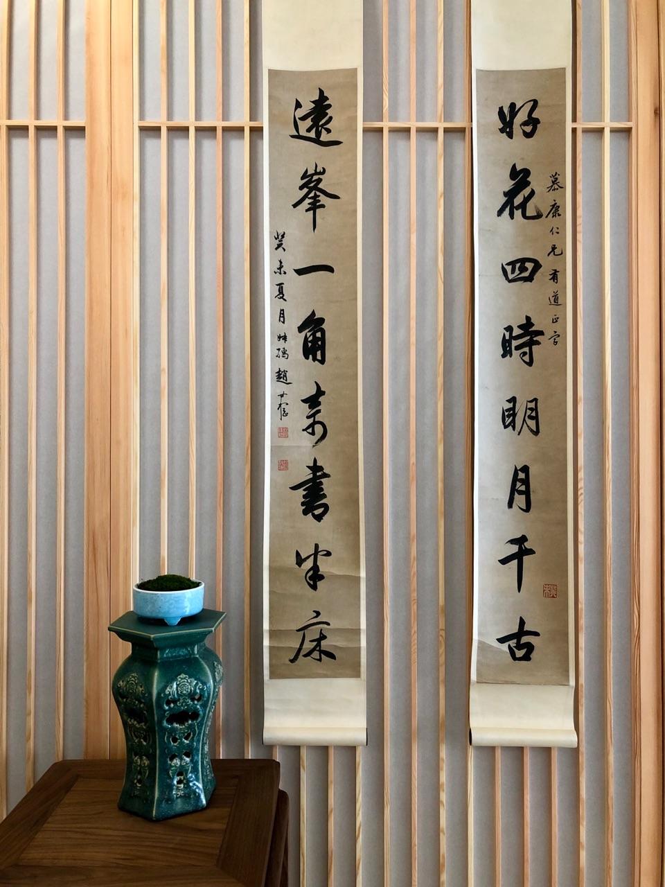 此行书八言联,赵氏承“二王”笔意并出入于赵子昂,行笔娟秀隽美,六法兼备,联右下方钤有“癸未”年款章,癸未为1967年,先生书此联刚好是我出生之年,是否缘份巧合,右上方有“慕康仁兄有道正字”,慕康即吾乡贤郑慕康,先生名师玄,号慕康,广东潮阳人,曾是民国时期潮汕名震上海的画家之一,生前为中国美术家协会会员,上海文史馆馆员。