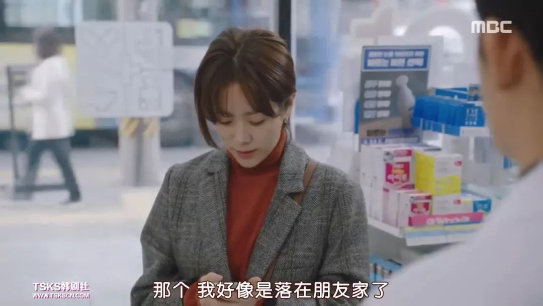 赶去公司前,静仁慌慌张张的跑去附近男主刘志浩所在的药店买醒酒药。