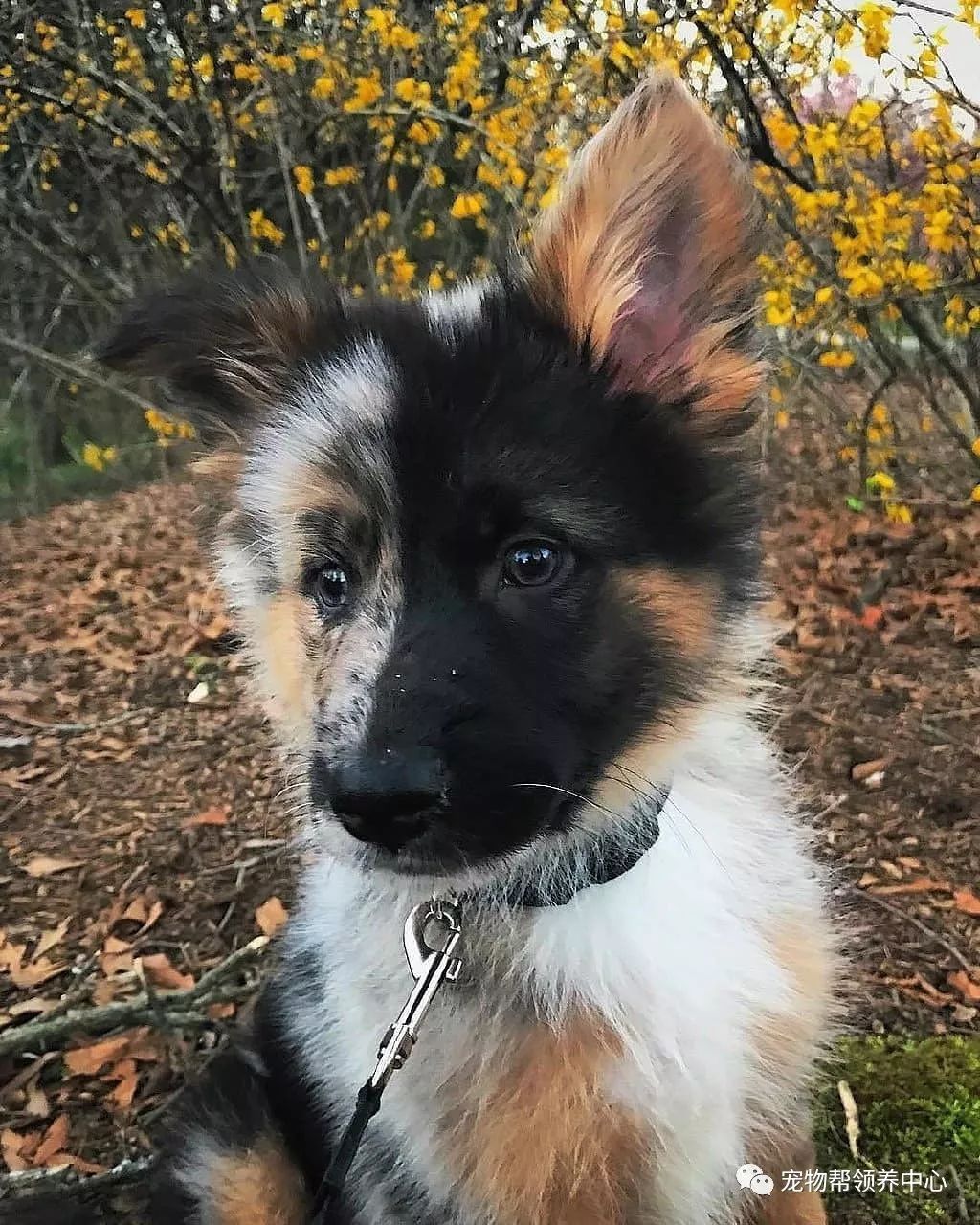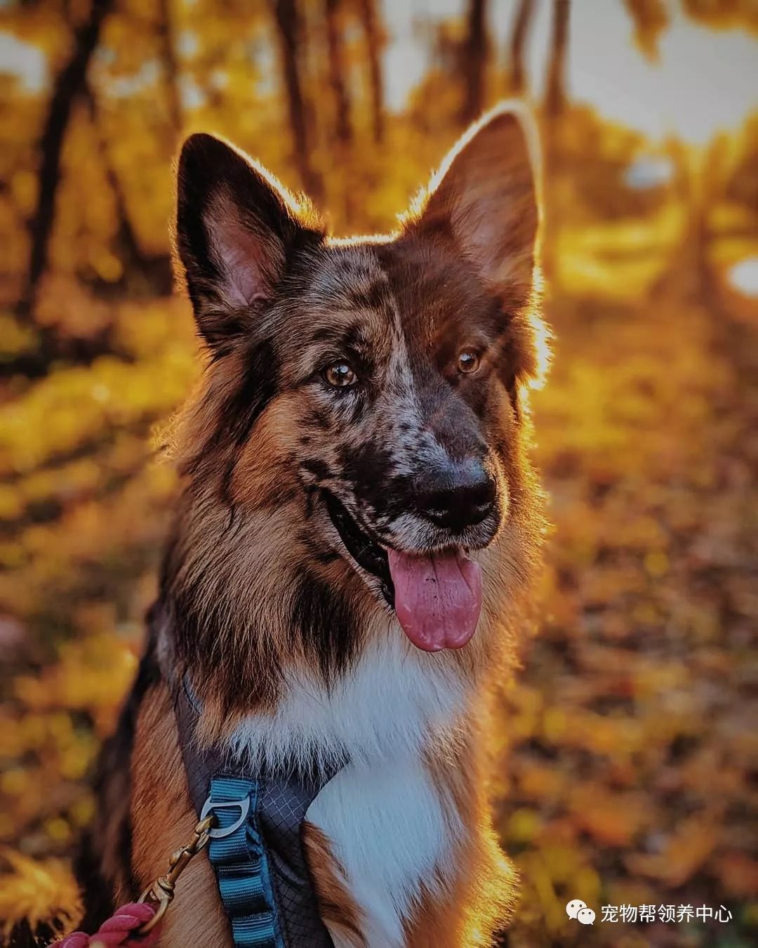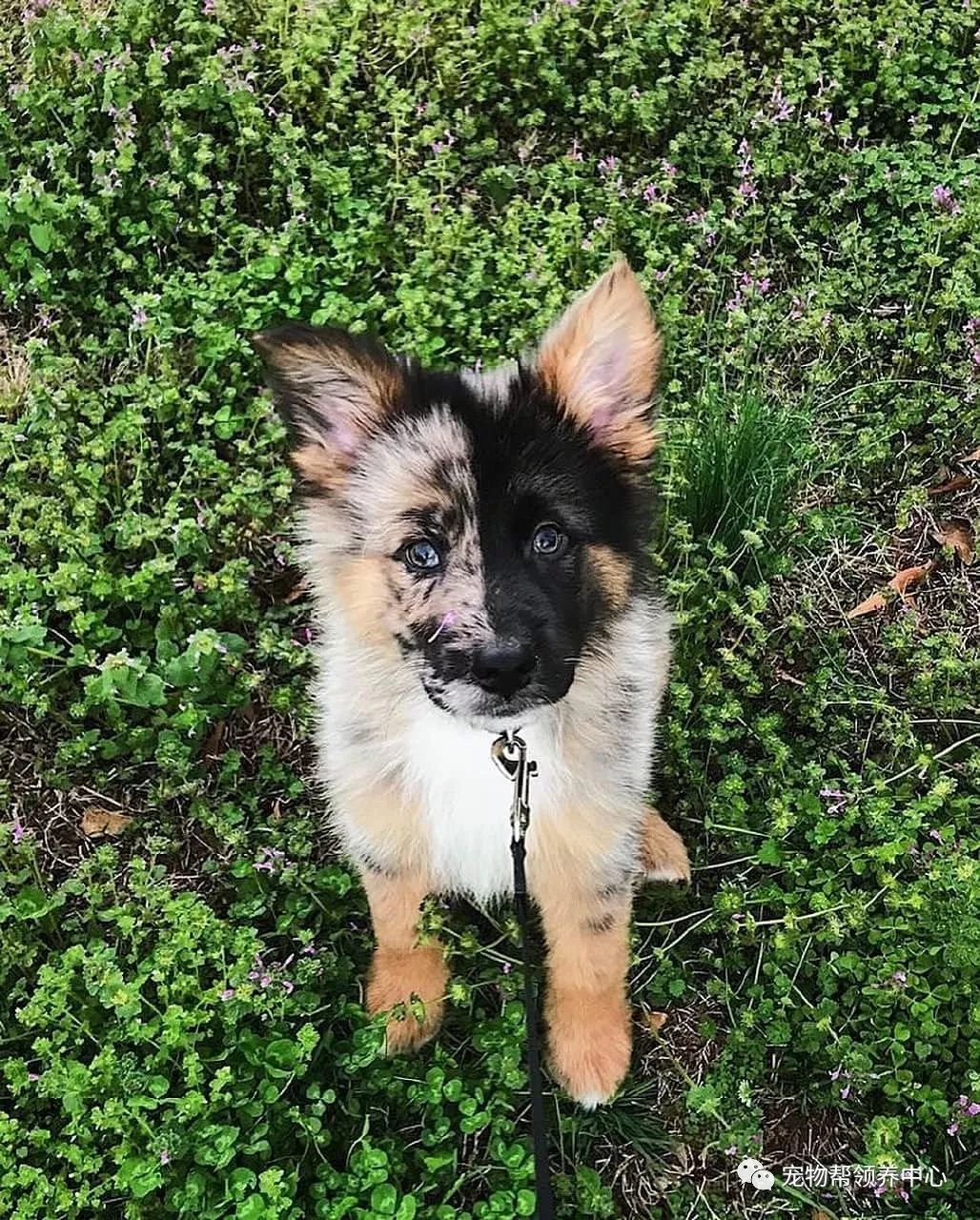 Logan的长相和平时常见的狗狗都不太一样,因为血统的原因,它的毛发颜色十分特别,左边脸继承了麻麻澳牧的花色,而右边脸继承了爸爸德牧的花色。