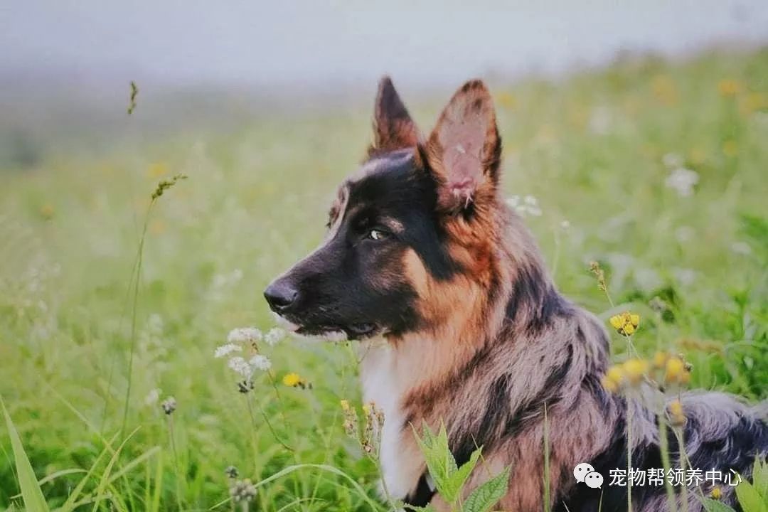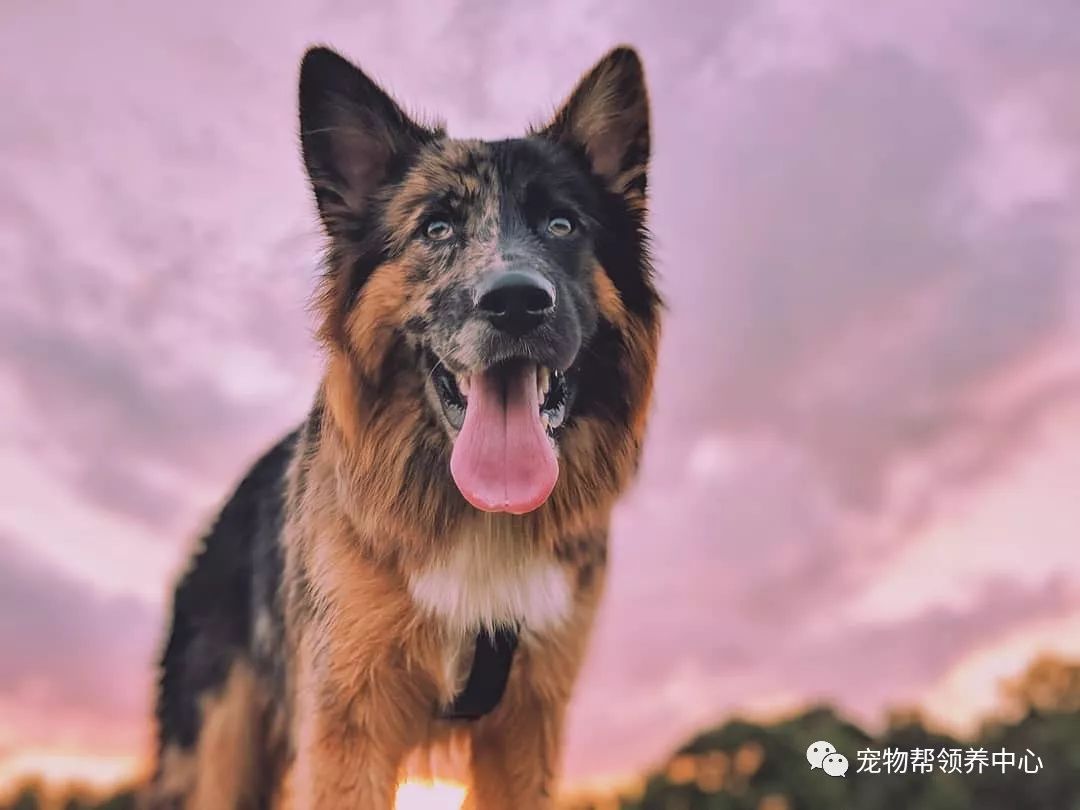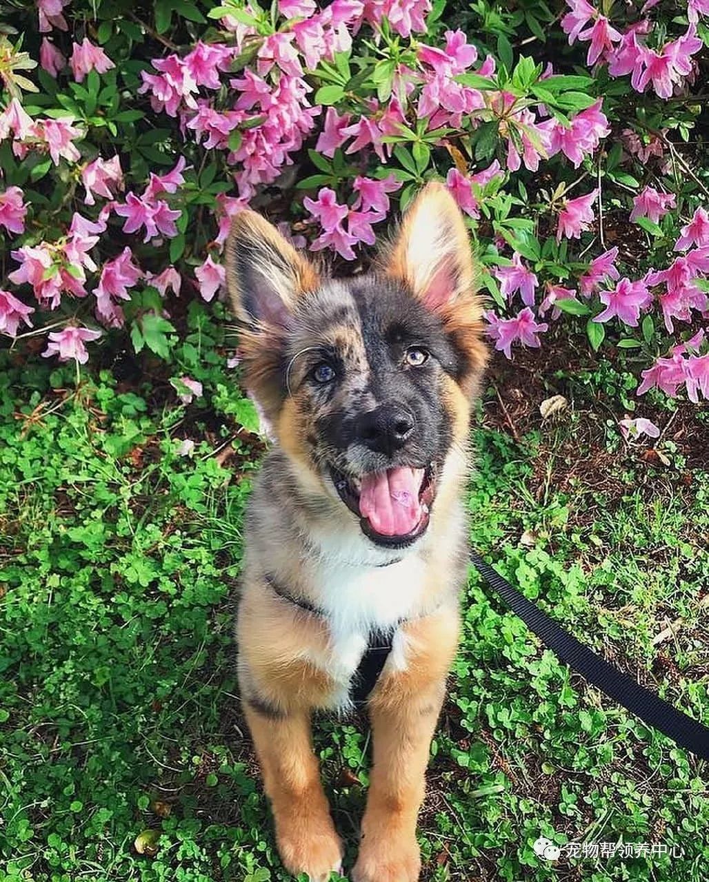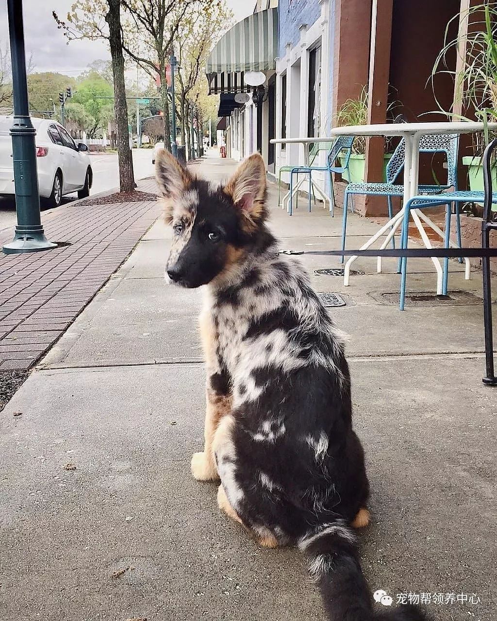 Logan的长相和平时常见的狗狗都不太一样,因为血统的原因,它的毛发颜色十分特别,左边脸继承了麻麻澳牧的花色,而右边脸继承了爸爸德牧的花色。