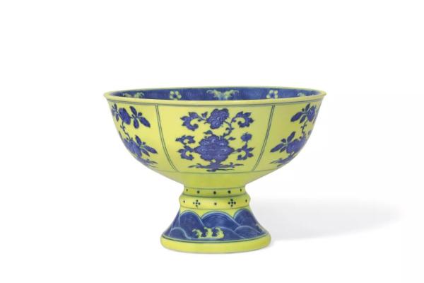 芝加哥艺术博物馆收藏的清乾隆黄地青花缠枝花卉纹高足盌 单行六字篆书款
