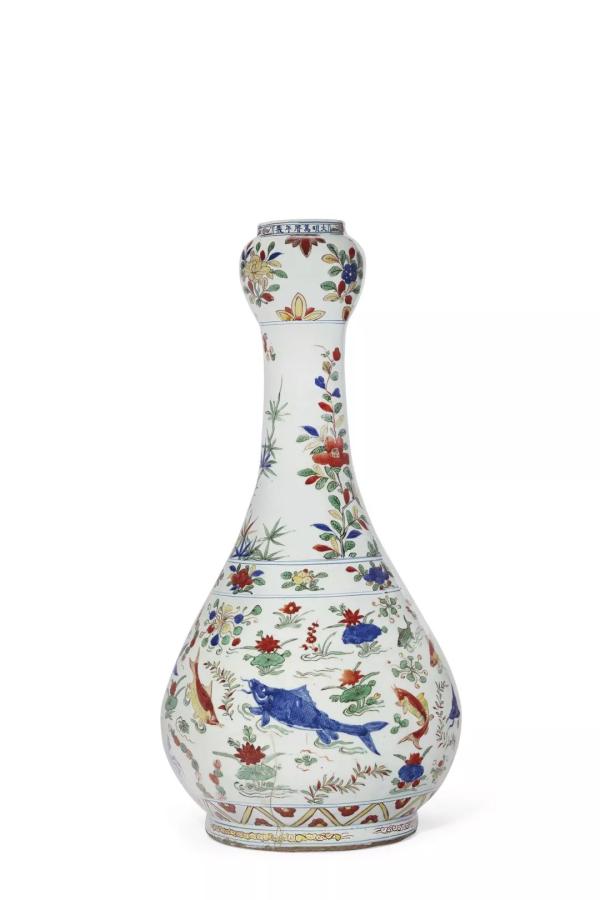 明万历 五彩鱼藻纹大蒜头瓶 单行六字楷书款,芝加哥艺术博物馆收藏品