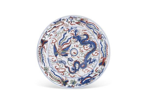 明万历 五彩龙凤纹盘 双圈六字楷书款