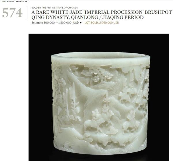 今年三月纽约苏富比“中国工艺精品”专场上210万美元成交的白玉笔筒,是芝加哥艺术博物馆委托的22件拍品中卖价最高的。©Sotheby’s New York