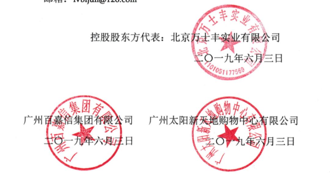 然而,在这份《通告》上,南都记者仅看到了北京万世丰实业有限公司的公章,以及广州百嘉信集团有限公司、广州太阳新天地购物中心有限公司的公章,并没有上海訾希的公章。