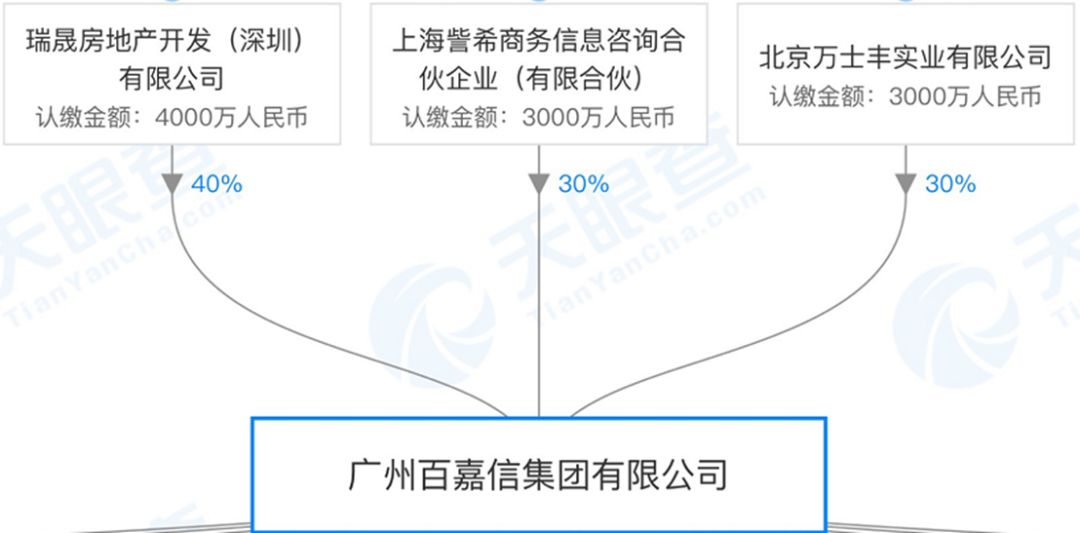 百嘉信集团股东为北京万士丰实业有限公司、 上海訾希商务信息咨询合伙企业(有限合伙)合计持有60%股权,瑞晟房地产开发(深圳)有限公司持有40%股权。