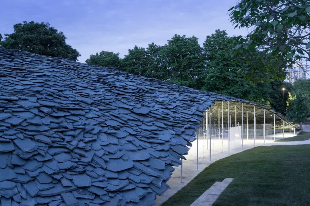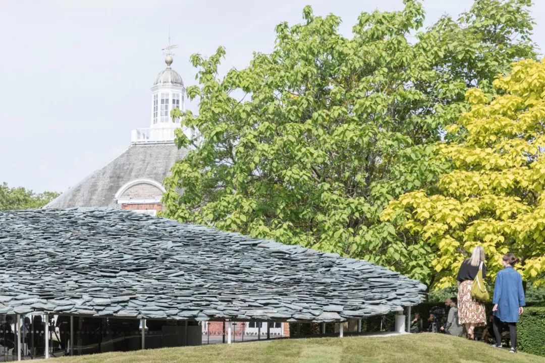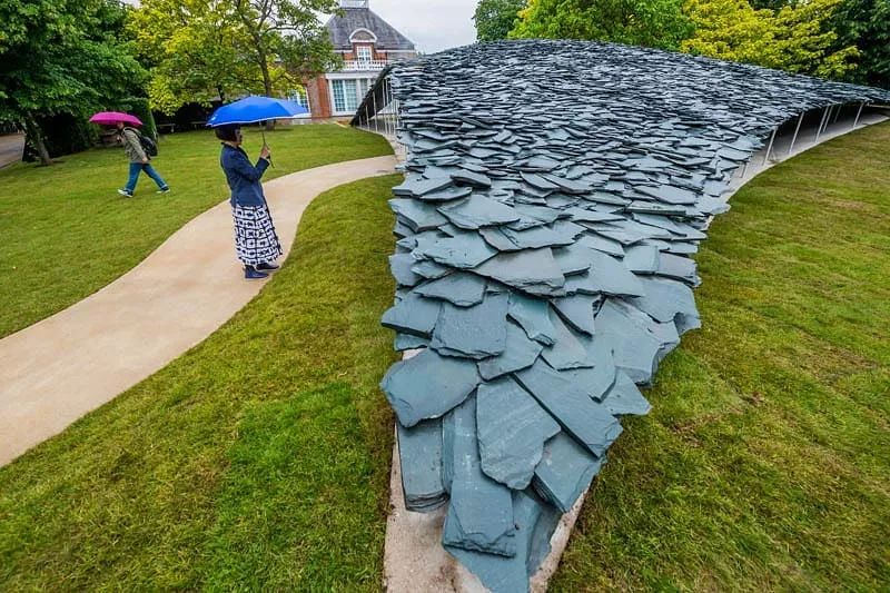 这个蛇形画廊最引人注目的,就是一片漆黑的石板屋顶,它像个公园里的巨型石头配景。