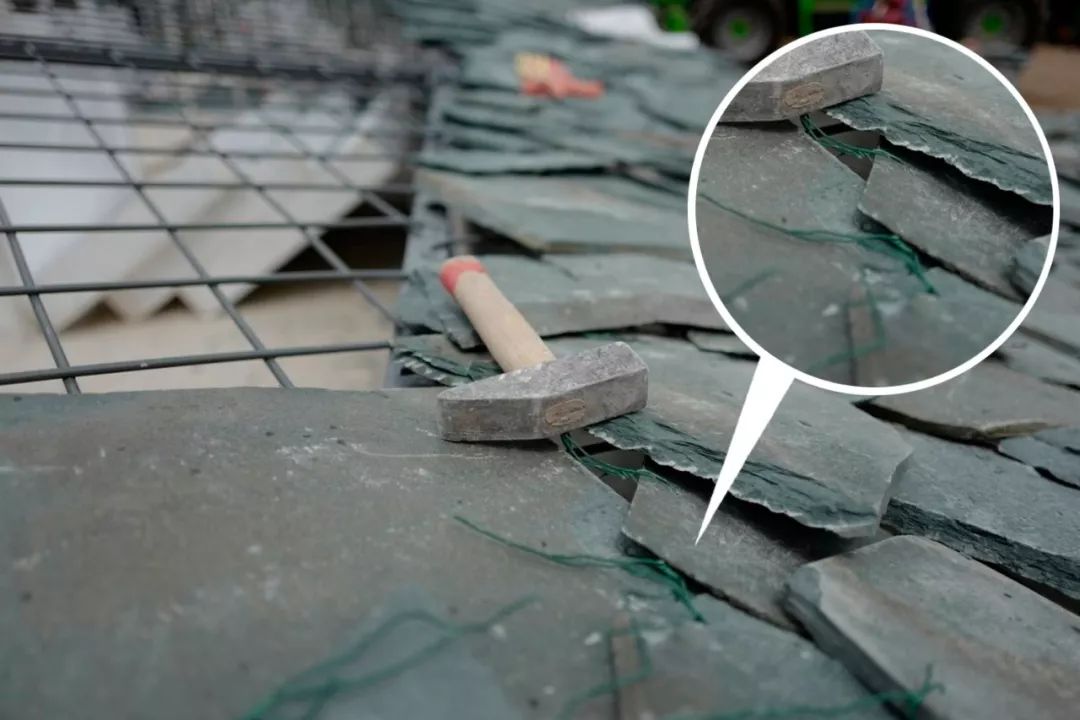 屋顶内部布置有一层铁丝网上,石板通过捆绑固定在铁丝网上,它们在相互作用下不会滑落。