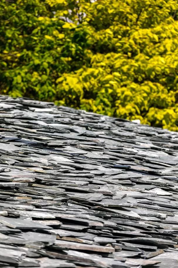 屋面其实是两层石板构成,它们之间夹有防水层,所以雨水会顺利排出。