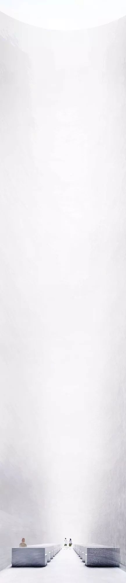 游人从入口走进教堂,高高的狭长天窗打下天光,天空是唯一能变化的场景。
