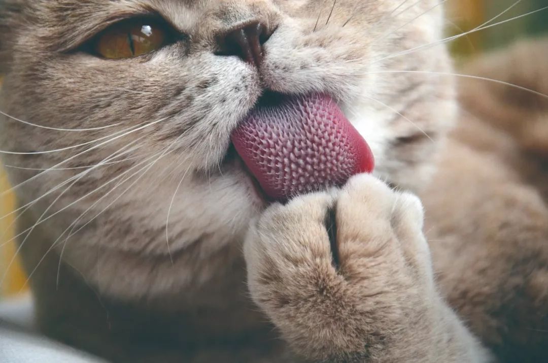 进食后,舌头可以舔舐掉牙齿上的一些残渣。跟人类相比,猫咪舌头的清洁能力更强,它的舌头上长有倒刺,当猫咪在舔舐身体时,倒刺会带走脱落的猫毛和猫毛上的一些灰尘,也会打开一些打结的毛发,达到清洁自身和梳理毛发的作用。