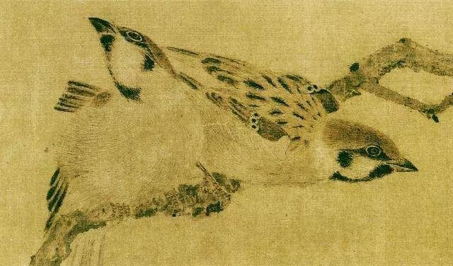 麻雀是很寻常的灵物,特别在乡村更是驱之不离地依着你、赖着你、甚至啁啾鸣叫烦着你。崔白在《寒雀图》里,惜墨如金,清淡着笔,九只麻雀各具形态,栩栩如生:或引啄理羽;或养神闭目;或驰颈呆望;或萎缩;或啁啾;或倒挂;或收翅……一只是个体,九只就是群体,它们把一树枝丫当成了温暖的家园。