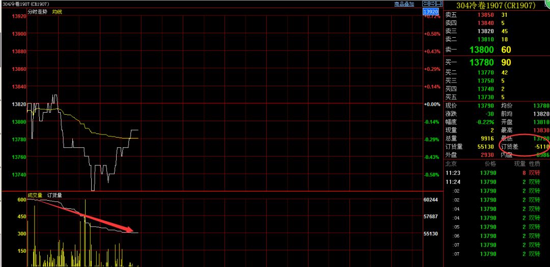 由于买方出逃不锈钢价格同时也就被打压,主力合约1907订货量减少最为明显,价格下跌,但是订货量未增加,也说明是原有多头出逃造成。截止今日上午收盘1907不锈钢合约减仓5000吨,其他合约也大多减仓2000吨。