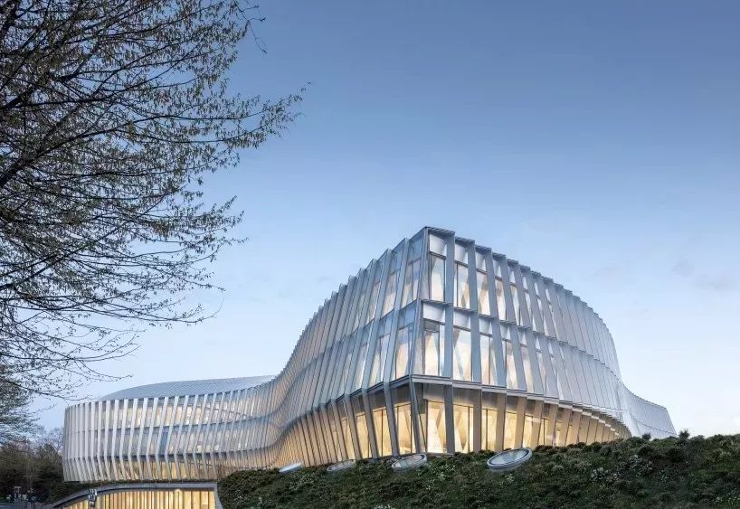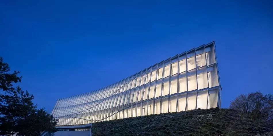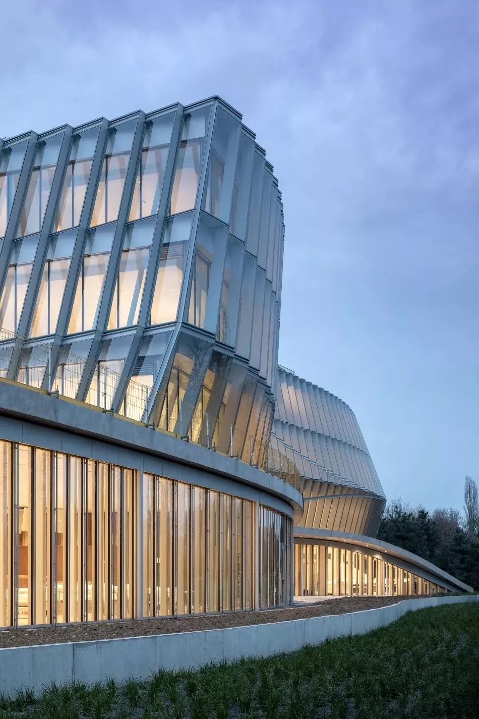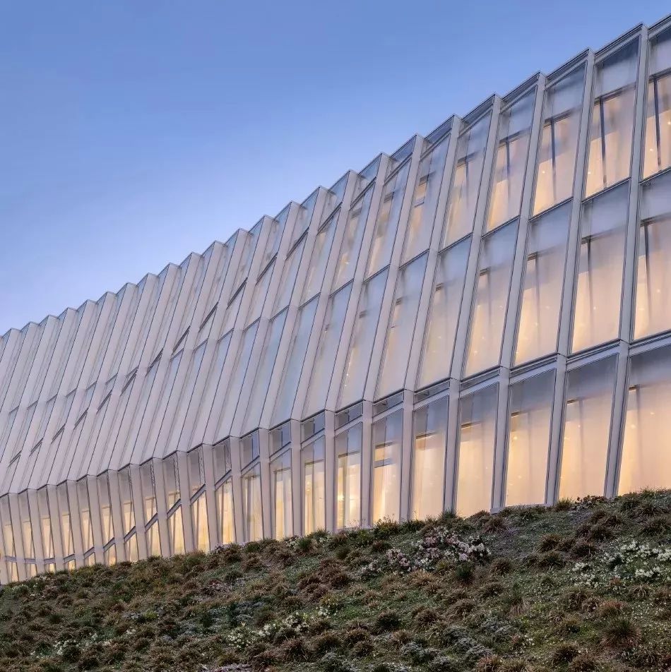 特殊的玻璃表面,使得自然光柔和地反射在玻璃面上。表层之间的空腔降低了来自周围公路的噪音干扰,内部遮光层有助于过滤摄入的光线,使外层得以保持完全透明的外观。