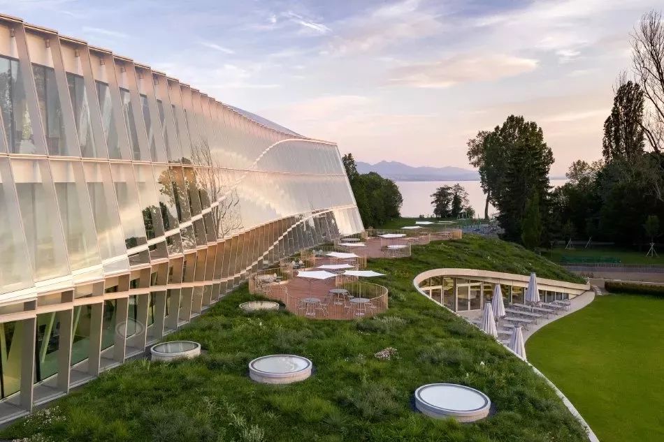 建筑很好地结合了地形,室外露台上的休息区可以观看到景色优美的日内瓦湖。