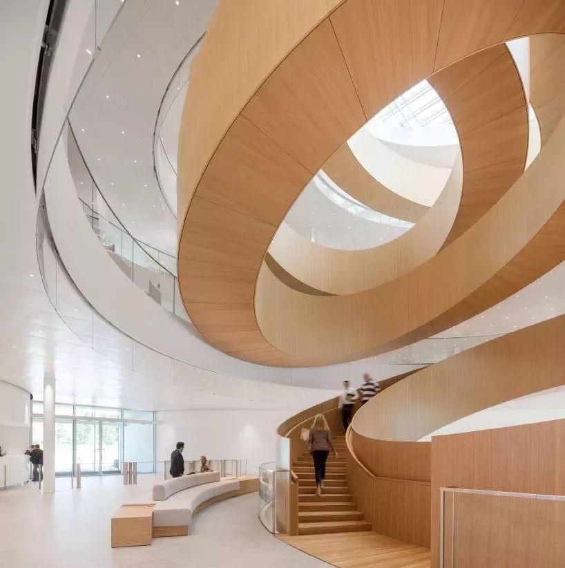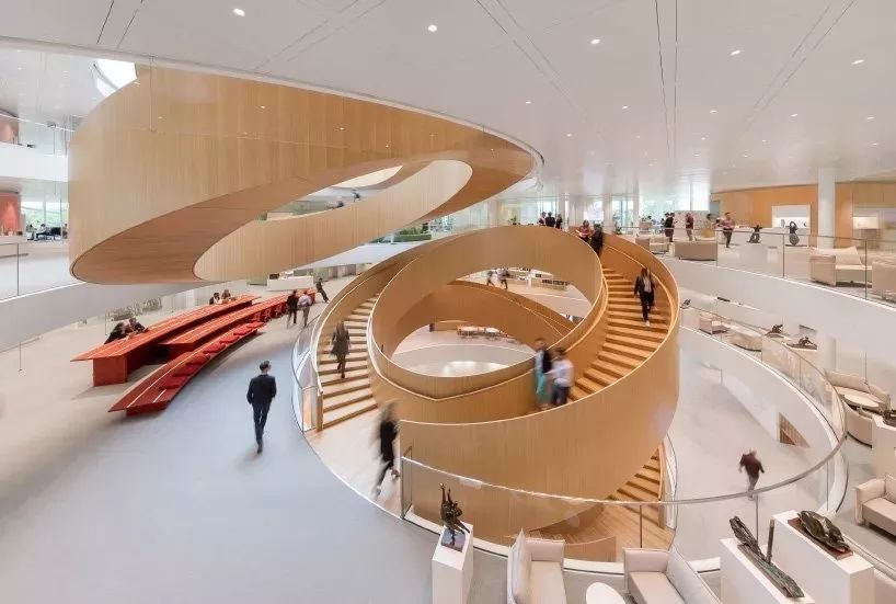 环形公共楼梯的设计参考了奥运五环的造型,矗立在建筑内,通过中庭自下而上地将五层空间连接了起来。中央楼梯周围还设有展览空间,自助餐厅和会议室。据设计团队称,该场地95%的建筑材料可以被再利用。