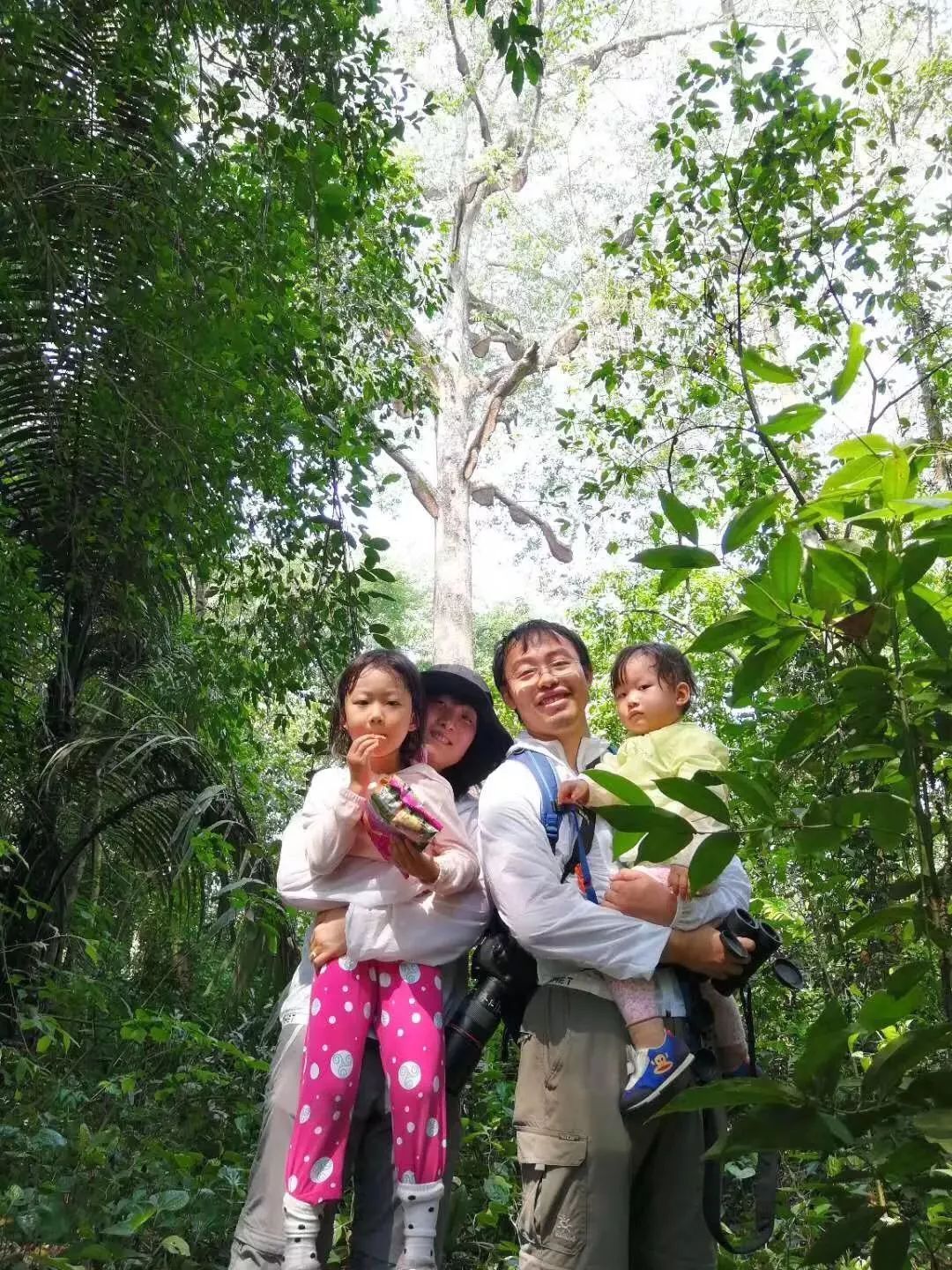 我们一家人在野外合影,背后的树枝上有一堆超大的蜂巢