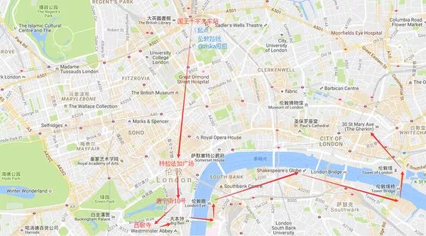 伦敦的著名地标都很密集,与其花费高额车费,还不如步行。从圣潘克拉斯火车站往大本钟方向走,大概走半小时吧,沿途经过许多许多景点。