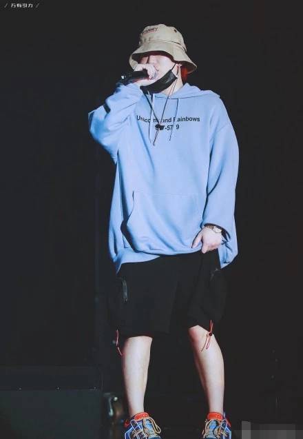 当天PG One身穿宽松的淡蓝色连帽卫衣搭配短裤,头戴渔夫帽,耳朵上还挂着黑色的口罩,整体造型都像此前一样十分随意,也很有嘻哈范儿。
