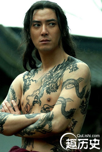 “只见空地上一个后生脱膊着,刺着一身青龙,银盘也似一个面皮,约有十八九岁,拿条棒在那里使。”……“老汉的儿子从小不务农业,只爱刺枪使棒,母亲说他不得,怄气死了,老汉只得随他性子。不知使了多少钱财,投师父教他。又请高手匠人与他刺了这身花绣,肩臂胸膛总有九条龙,满县人口顺,都叫他做九纹龙史进。”(见《水浒全传》第二回“王教头私走延安府,九纹龙大闹史家村”)