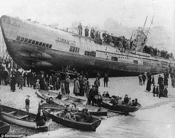 ▲搁浅在苏塞克斯郡海滩的U型潜艇