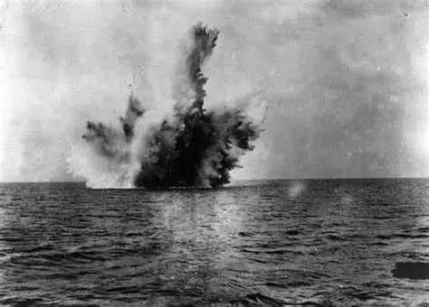 两枚鱼雷发射后,一点没防备的补给舰不幸被击中,舰上的弹药立马被引爆,火光、浓烟弥漫海面。