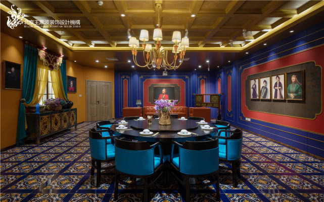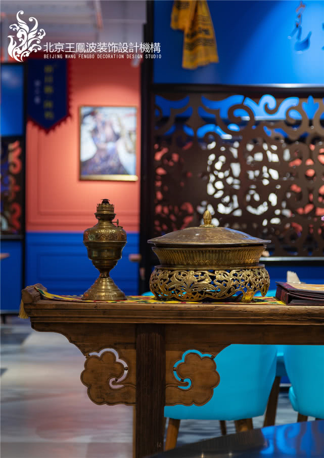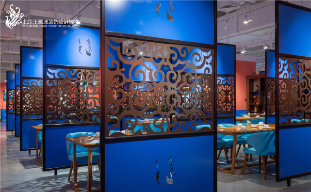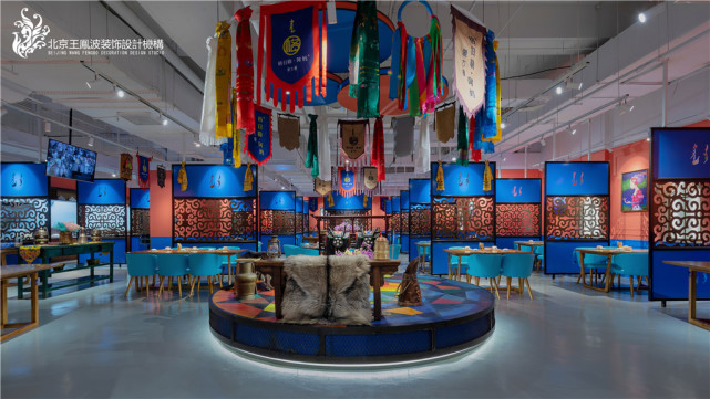 案例整体为非常具有内蒙特色的民族风格,大量运用内蒙元素,大量运用红色、蓝色、黄色等鲜明色彩,为整个餐厅风格奠定内蒙特色基调。