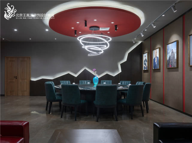 整个包间运用沉稳大气的灰色布置空间,展现草原男性的高大伟岸形象。并用民族特色红色来点缀,这面墙的墙面软包设计,用红色区分每一部分,仿佛置身于蒙古包就餐。