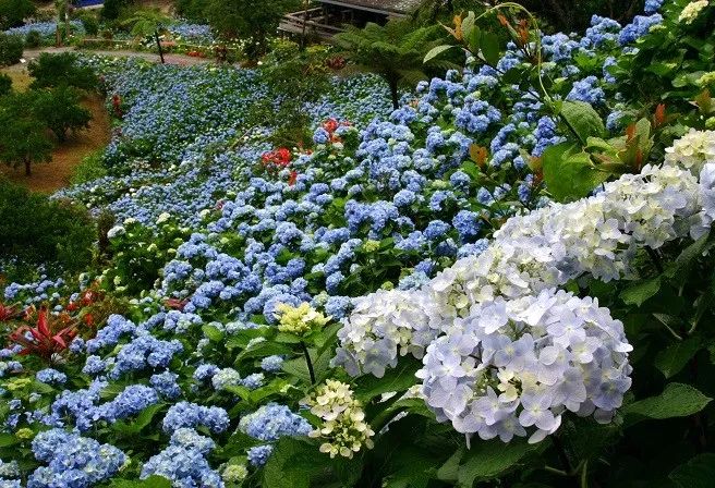 比如常见的无尽夏绣球花,如果土壤酸碱性,那它在同一棵树上还能同时开出粉色和蓝色的花朵。