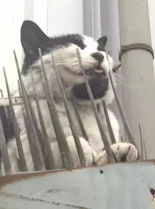 在远处看到了一只猫咪在装了防猫刺垫的围墙上面,一开始还以为它被刺受伤了动弹不得等待救援…但走近一看…