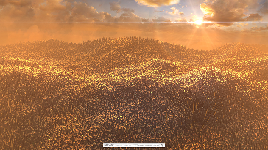 这项测试在帧与帧之间使用固定的时间步长,因此可以保证在测试时不同的硬件都会执行相同的工作量。测试将大量顶点和纹理数据上载到显卡,测试运行时顶点数据量会逐渐增加,由于带宽达到饱和,系统渲染每一帧画面花费的时间也会增加,但是使用的总带宽量维持不变。软件会根据测试时的平均带宽占用提供最终的测试结果。