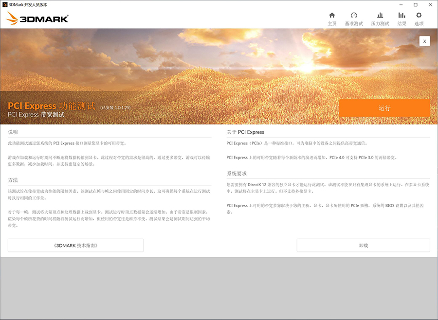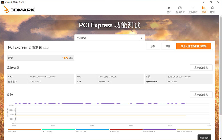 根据说明,3DMark的PCI Express功能测试可以通过PCIe接口测试显卡的可用带宽,并表示更多的贷款可以让游戏运行传输更多的数据,减少游戏的加载时间,并可以在更加复杂的场景当中跑出更流畅的成绩。