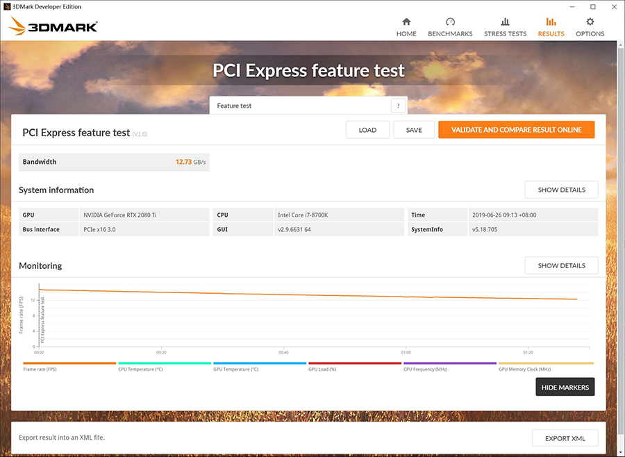 目前相关测试已经上线,购买3DMark Advanced Edition或3DMark Professional Edition的用户都可以免费试用,兼容任何支持Direct X 12的独立显卡,大家更新3DMark就可以直接使用了。由于这项测试的主体是PCIe插槽,所以不能测试核显相关内容,而且如果你的电脑有多个显卡,它只会测试主显卡。为了更好的了解这项功能,我也用我手头的测试平台进行了测试,大概规格为英特尔酷睿i7-8700K、技嘉 Z370 AORUS Gaming 3、技嘉 AORUS 8GB DDR4-3200x2、技嘉 GeForce RTX 2080 Ti Gaming OC。