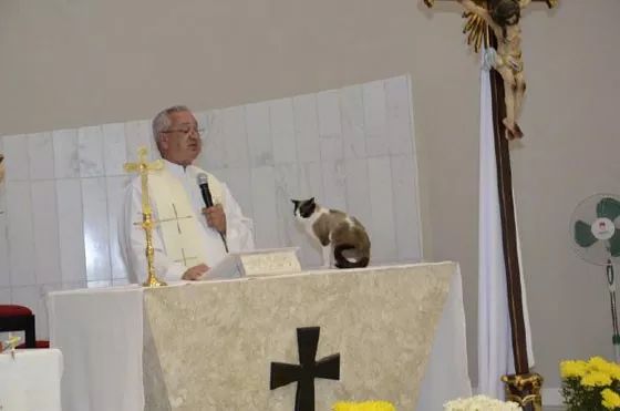 神父在主持弥撒时,一只猫闯了进来站在台上,它的举动笑屎了!
